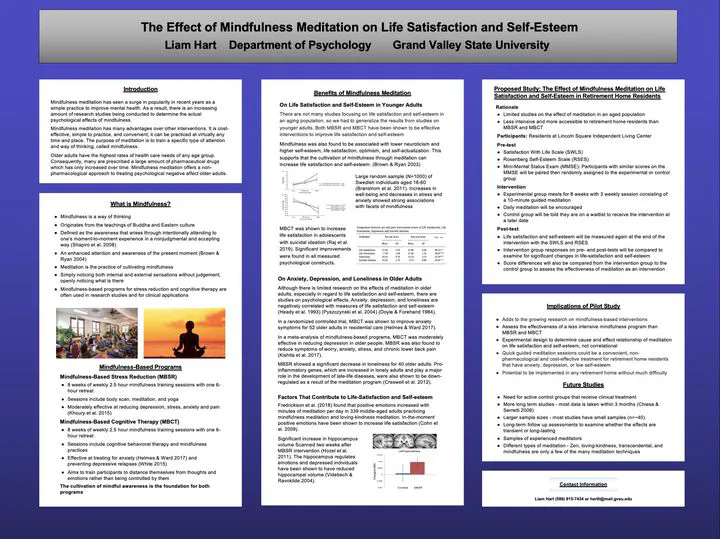 Mindfulness can be used to describe a variety of practices and processes that generally involves focusing on the present moment and being conscious and aware. Mindfulness meditation has been shown to decrease stress, anxiety, and depression, so it is likely that it will increase life satisfaction and self-esteem. In this poster, I will propose a study that seeks to determine the effect of mindfulness meditation on life satisfaction and self-esteem in older adults living in retirement homes. Participants will undergo an 8-week mindfulness meditation intervention, following a 10-minute guided meditation 4 times per week and will be encouraged to practice daily. Life satisfaction and self-esteem will be measured before and after the 8-week mindfulness meditation